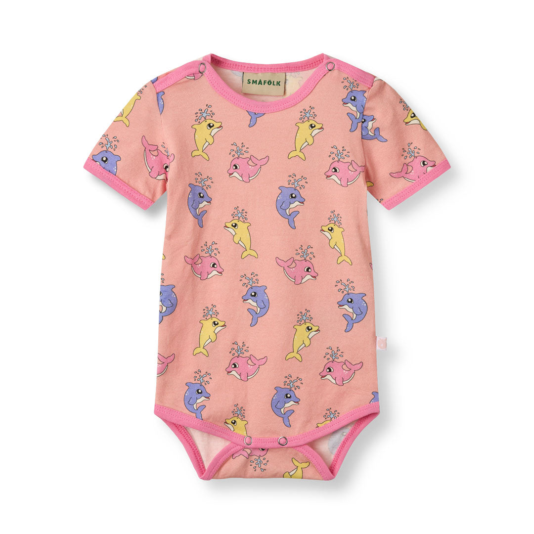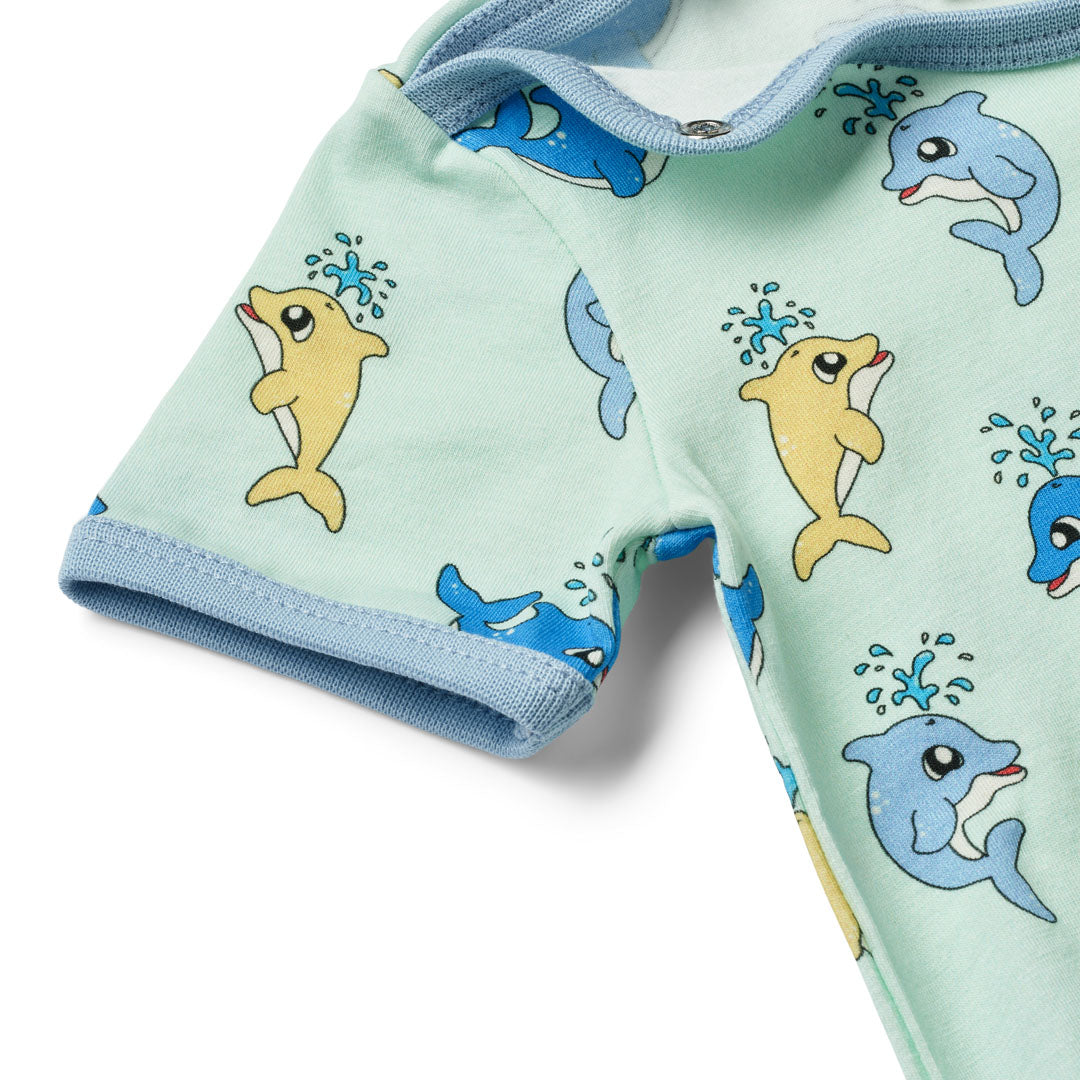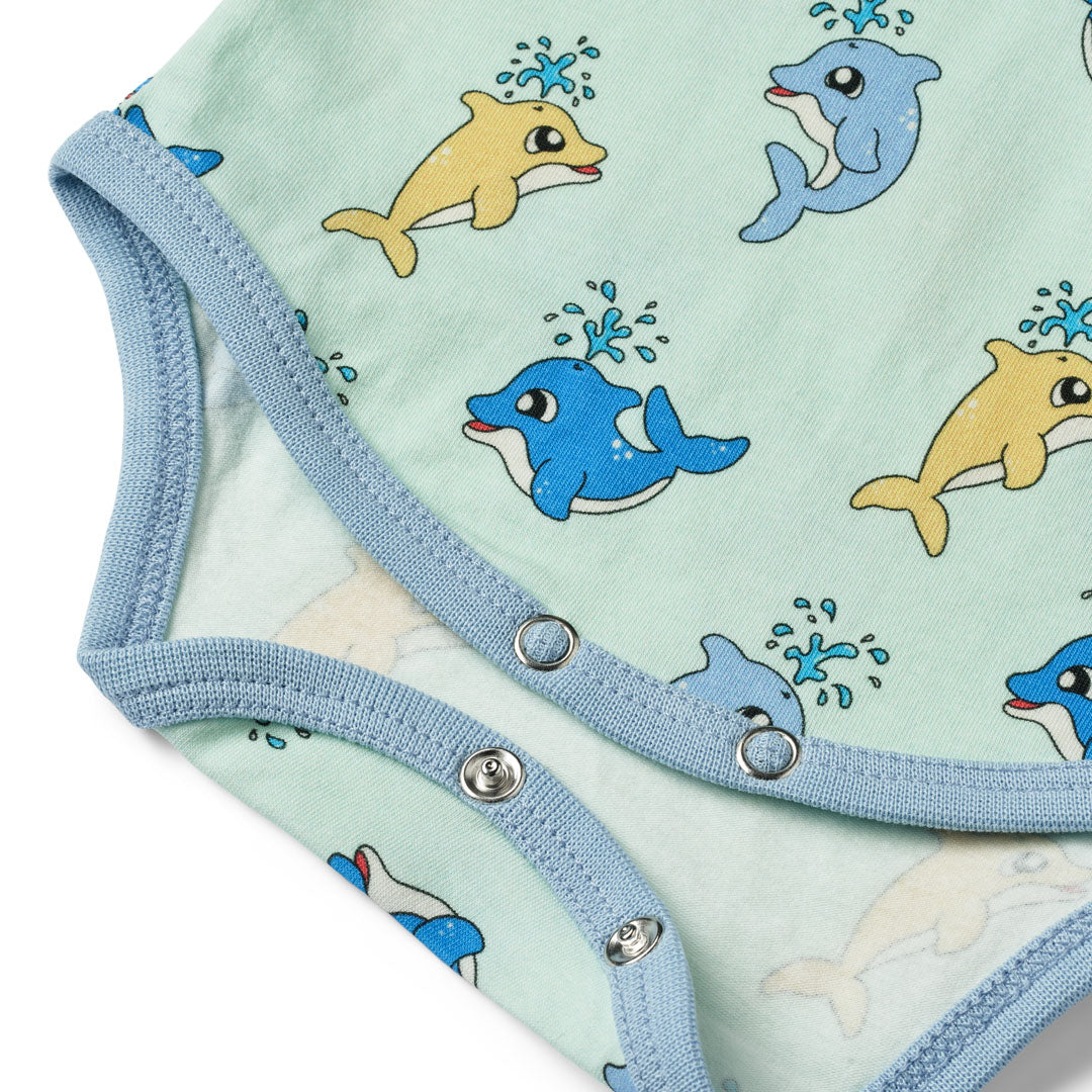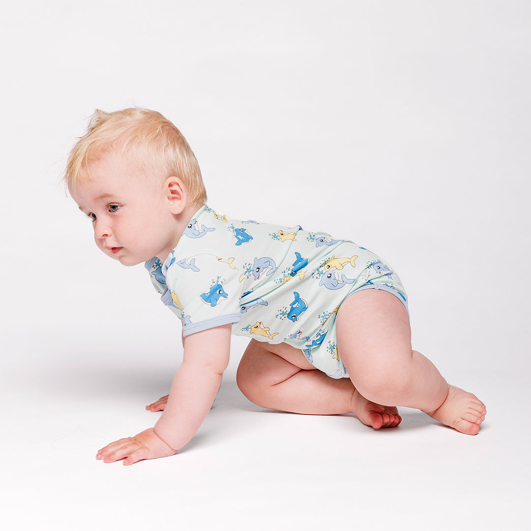 オーガニックで伸縮性のあるコットンジャージーを使用した、イルカのベビーロンパース。このロンパースはエコテックス規格100®の認証を受けており、お子さまの肌と健康を守るため、有害な化学物質が含まれていないことを確認済みです。肩と股にプレススタッズが付いているので、着替えも簡単です。スモーフォークのロンパースはデンマークでデザインされ繰り返し洗っても色落ちや型崩れしにくい仕様になっています。