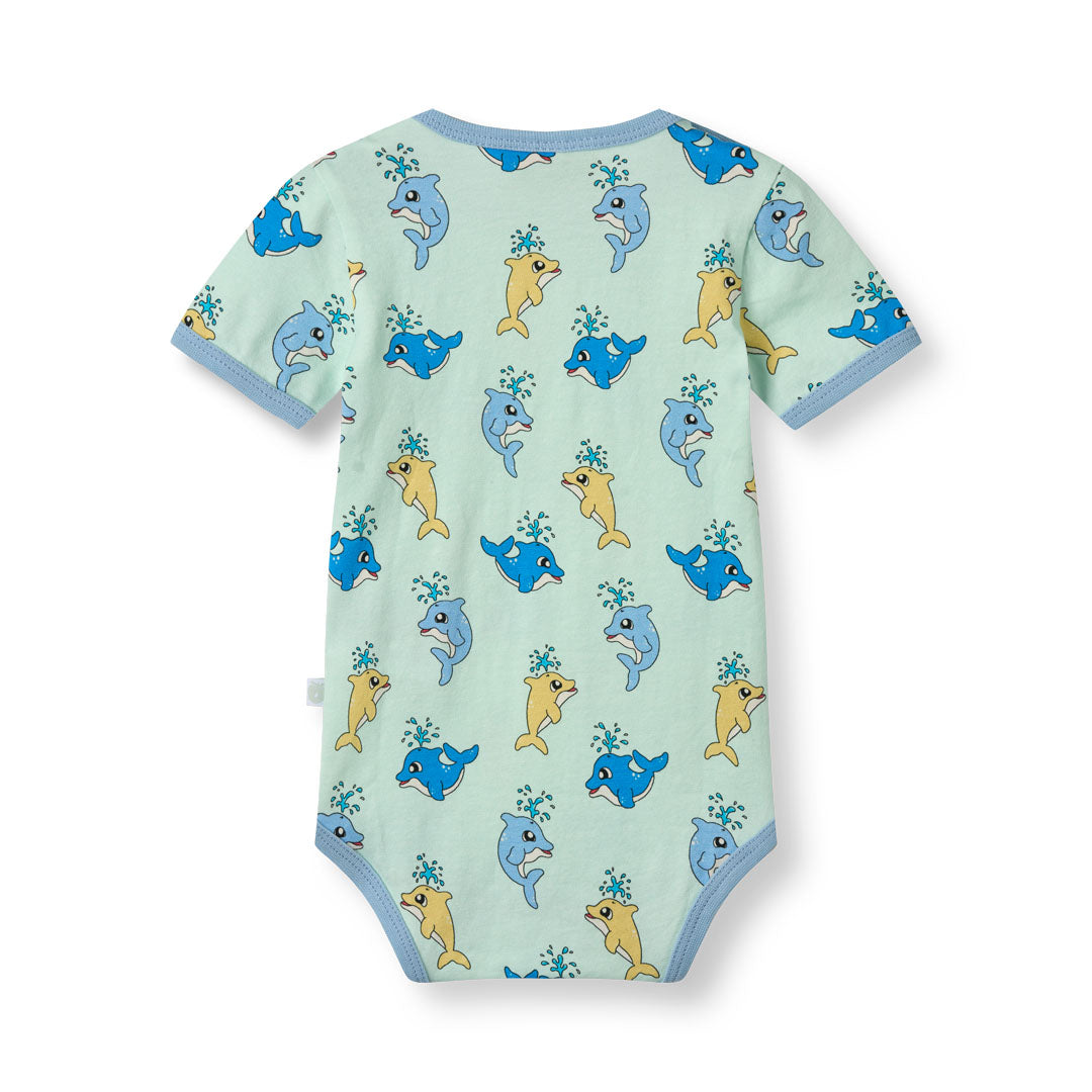 イルカが水しぶきをあげながら楽しそうにダンスしています。とても可愛らしいデザインでお子様にも人気です。