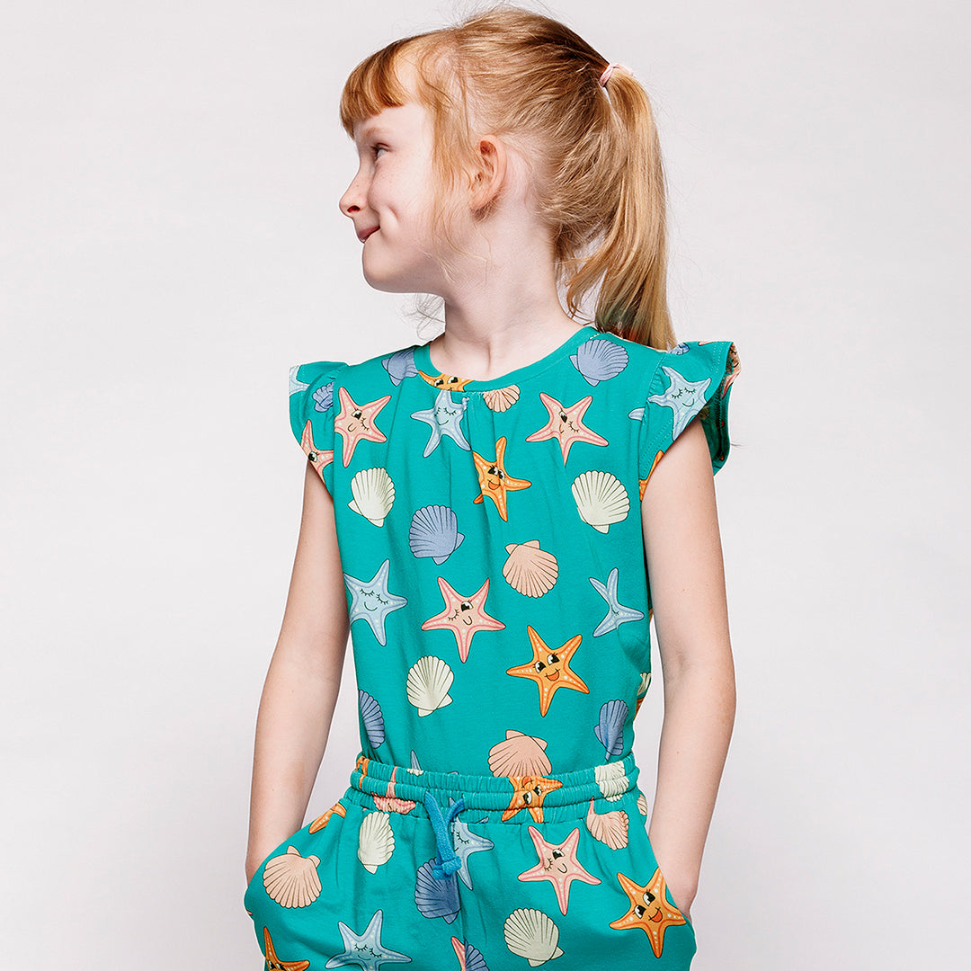 ヒトデと貝殻の半袖トップス。オーガニックで伸縮性のあるコットンジャージーの素材で作られていて、エコテックス規格100®の認証を受けています。このトップスは有害物質が含まれていないか検査済みで、お子様の肌と健康に配慮しています。首元にはプリントの縁取りがあり、袖は短いフリルになっています。このトップスは、繰り返し使っても形や色が落ちないようにデンマークでデザインされています。