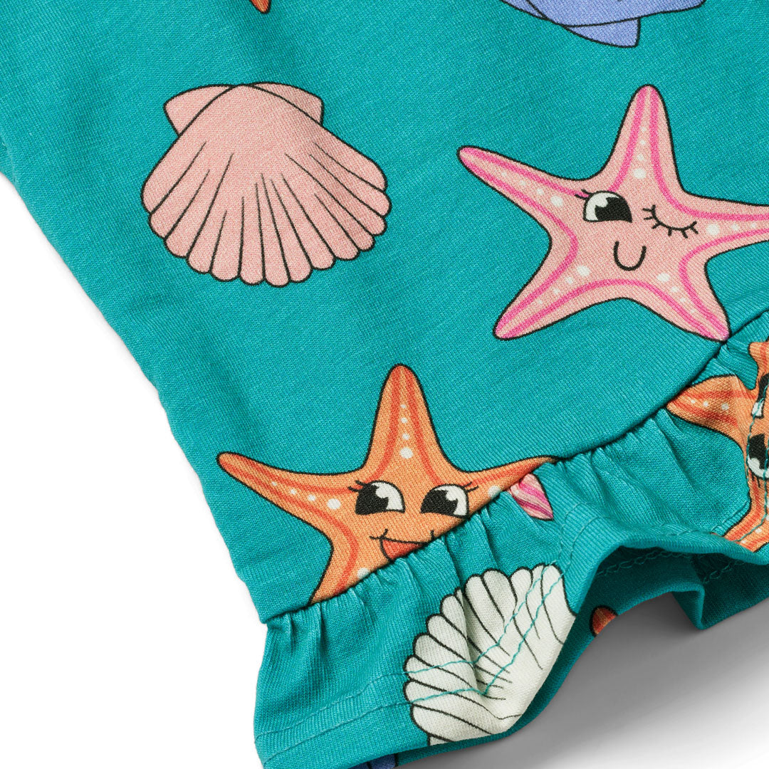 ヒトデと貝殻をあしらったショートパンツは、オーガニックで伸縮性のあるコットンジャージー製。エコテックス規格100®の認証を受けており、有害物質の検査済みなので、お子様の肌と健康に配慮しています。ウエストはゴムと紐で調節でき、裾にはフリルが付いています。スマフォークのショートパンツは、繰り返し使っても形や色が落ちないようにデンマークでデザインされています。