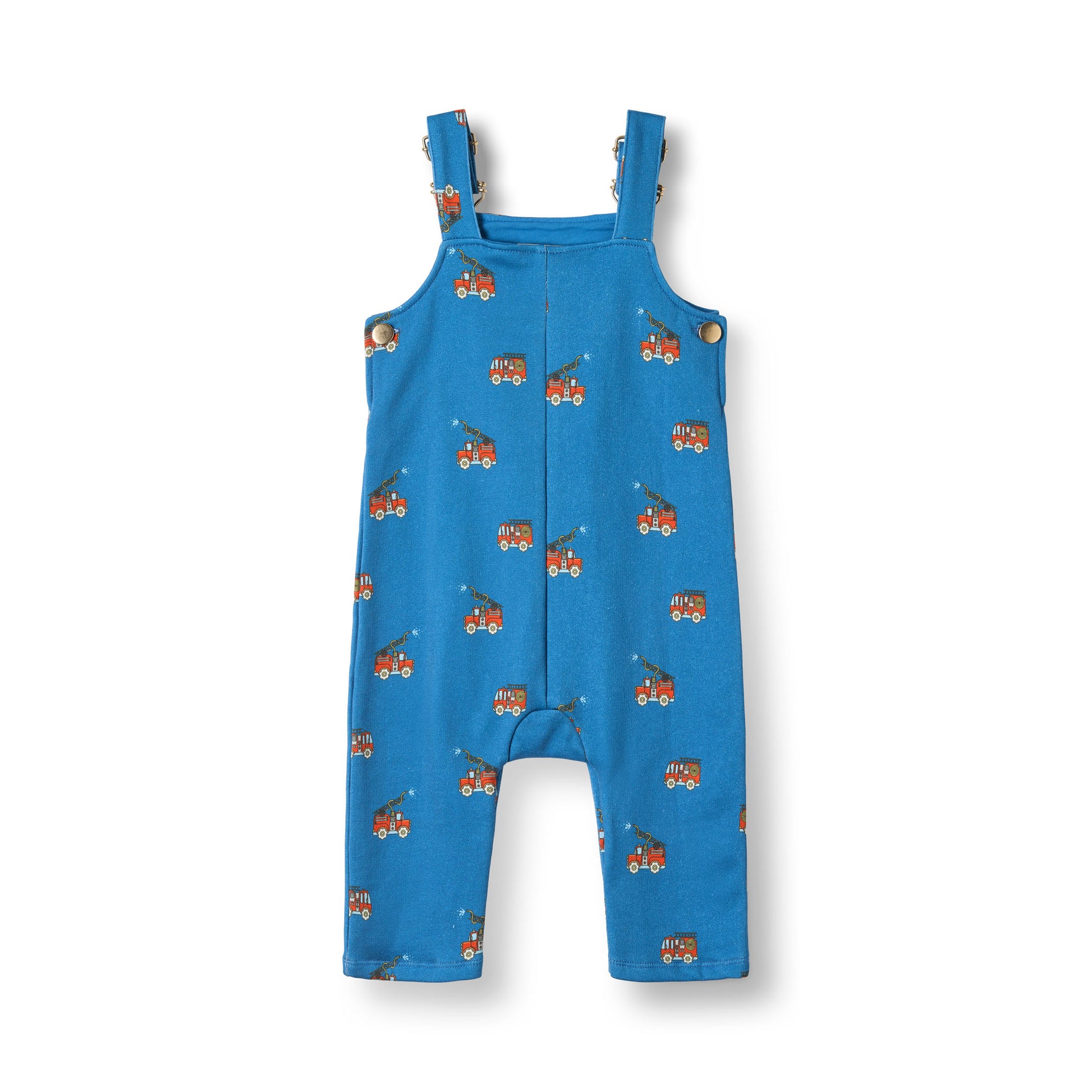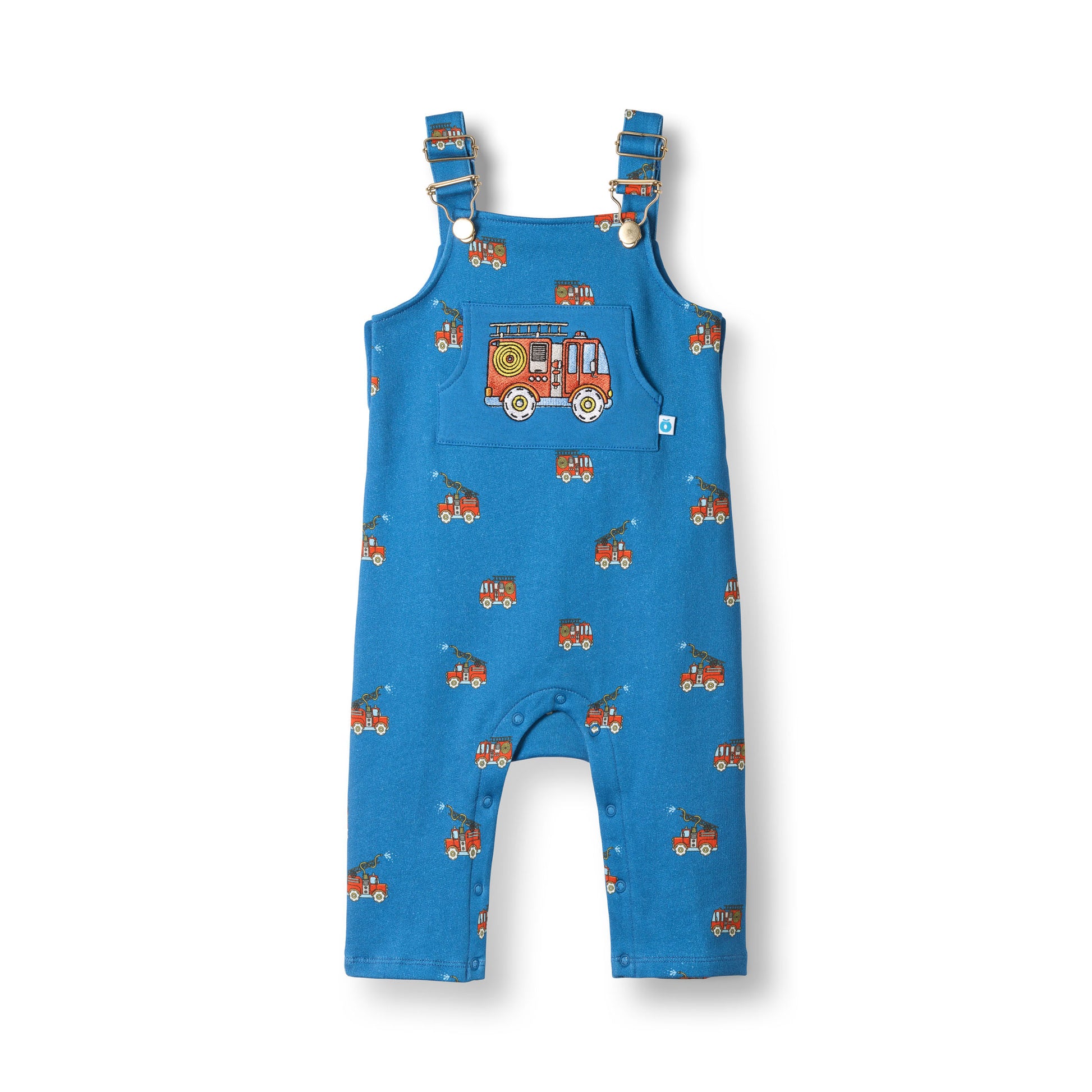 やわらかくて暖かい裏起毛スウェット素材(オーガニックコットン100%)で仕立てた、ファイヤートラック(消防車)柄のベビーオーバーオールです。