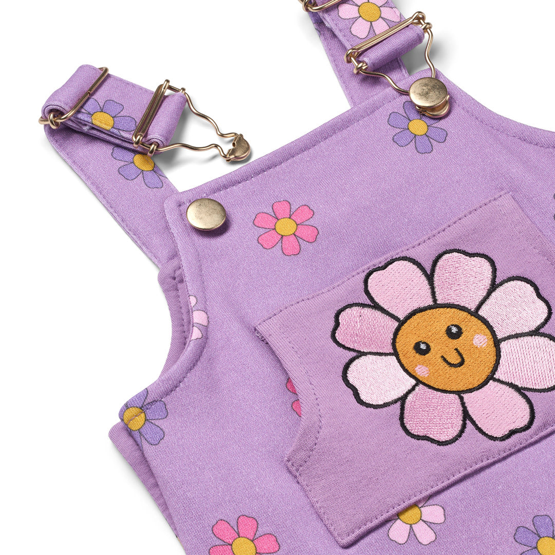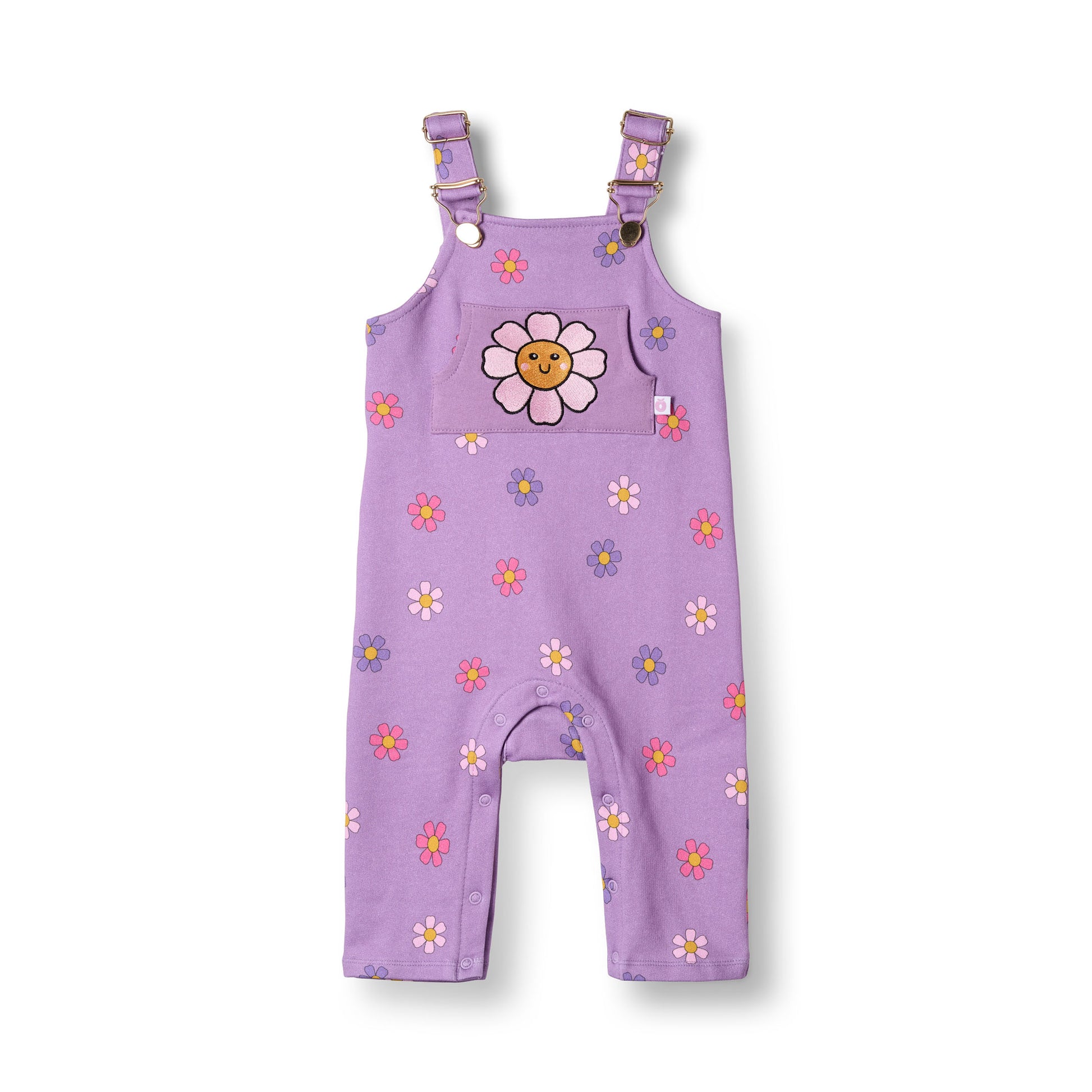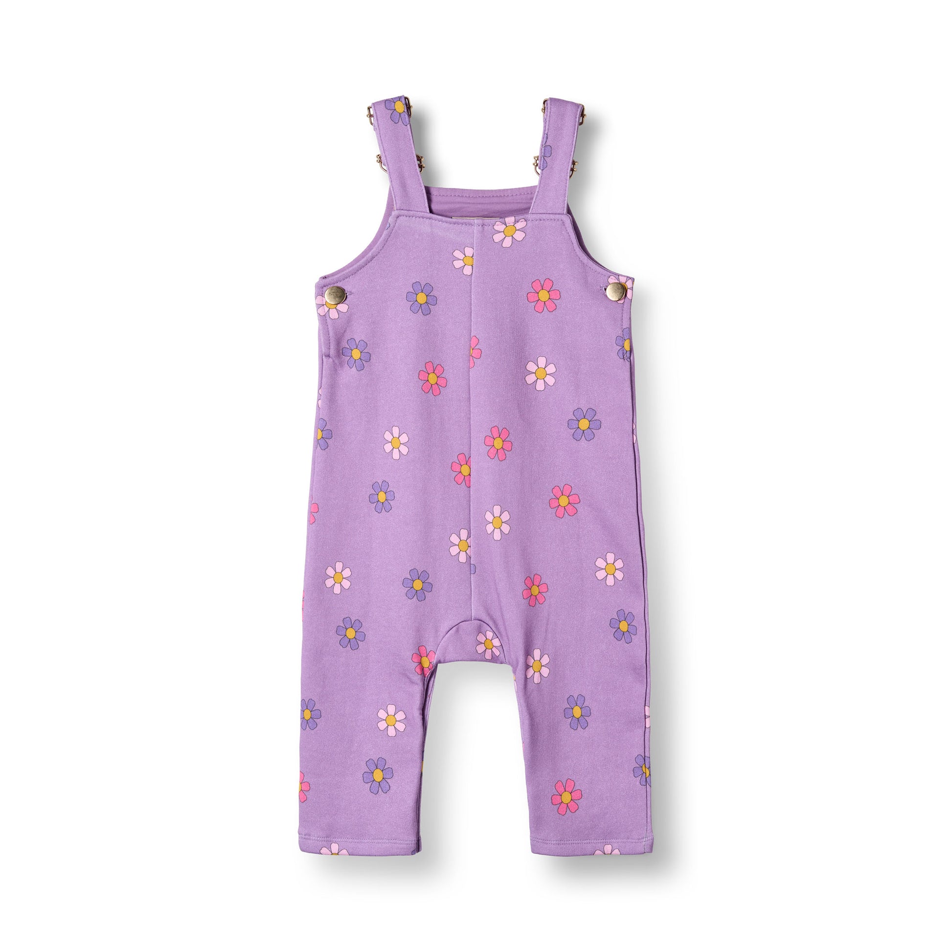 やわらかくて暖かい裏起毛スウェット素材(オーガニックコットン100%)で仕立てた、フラワープリントのベビーオーバーオールです。