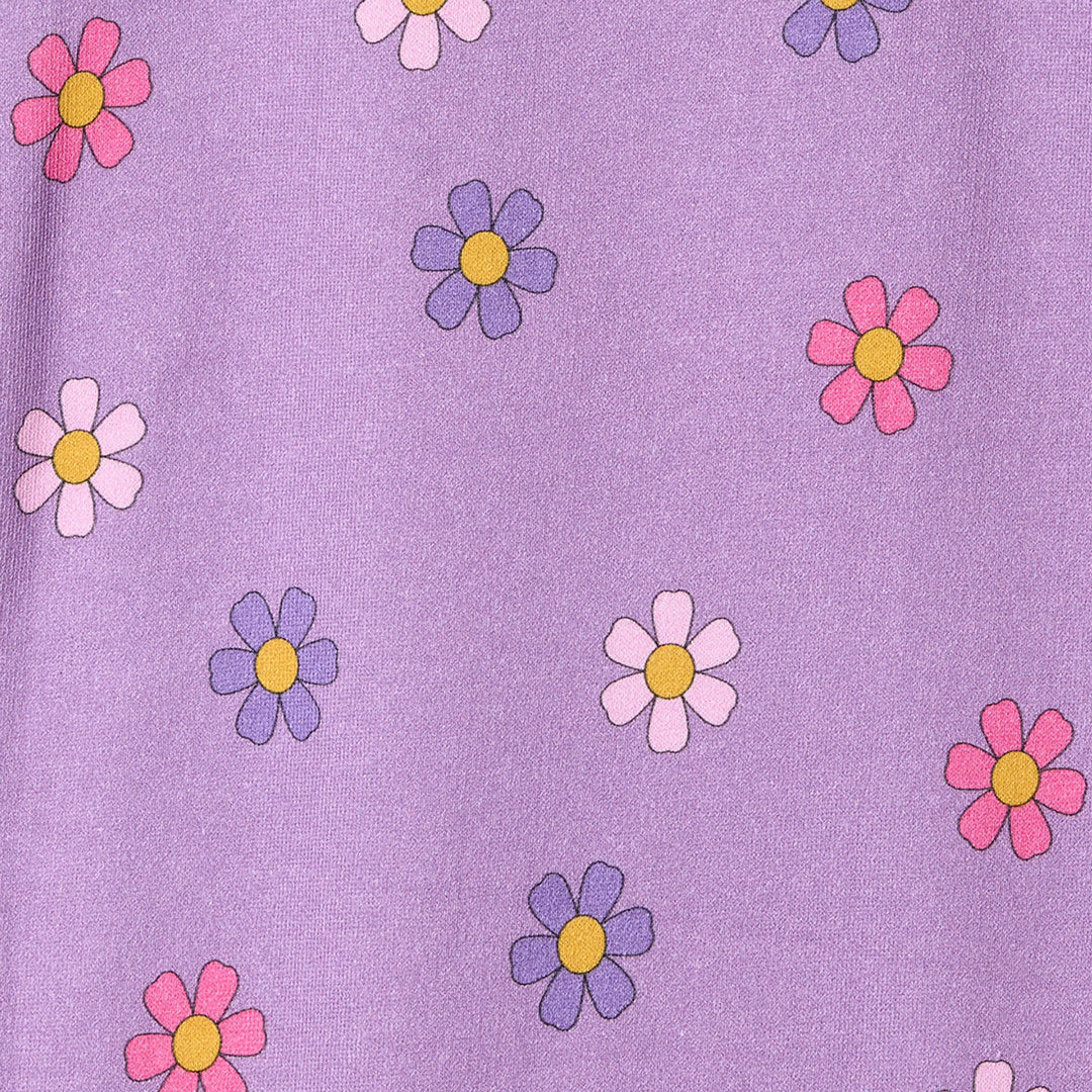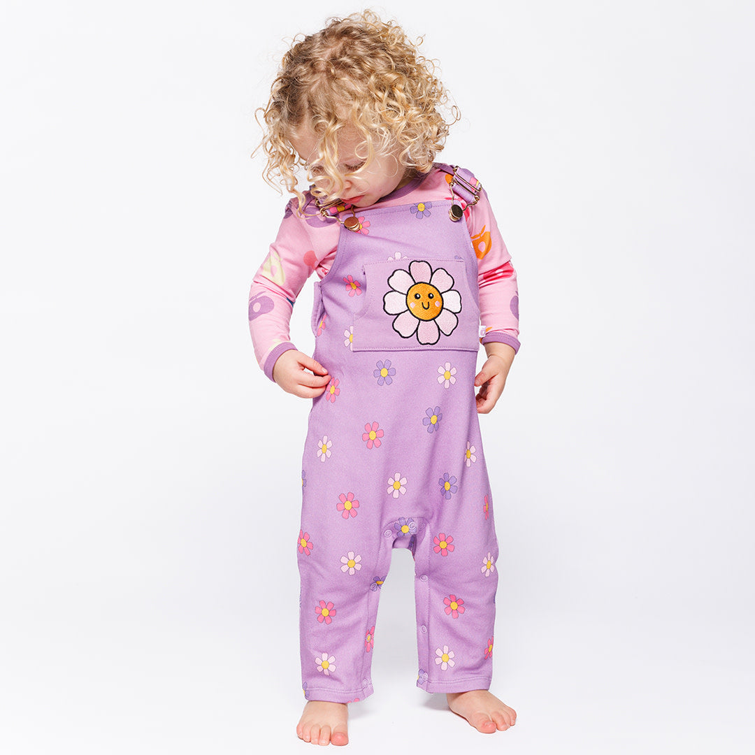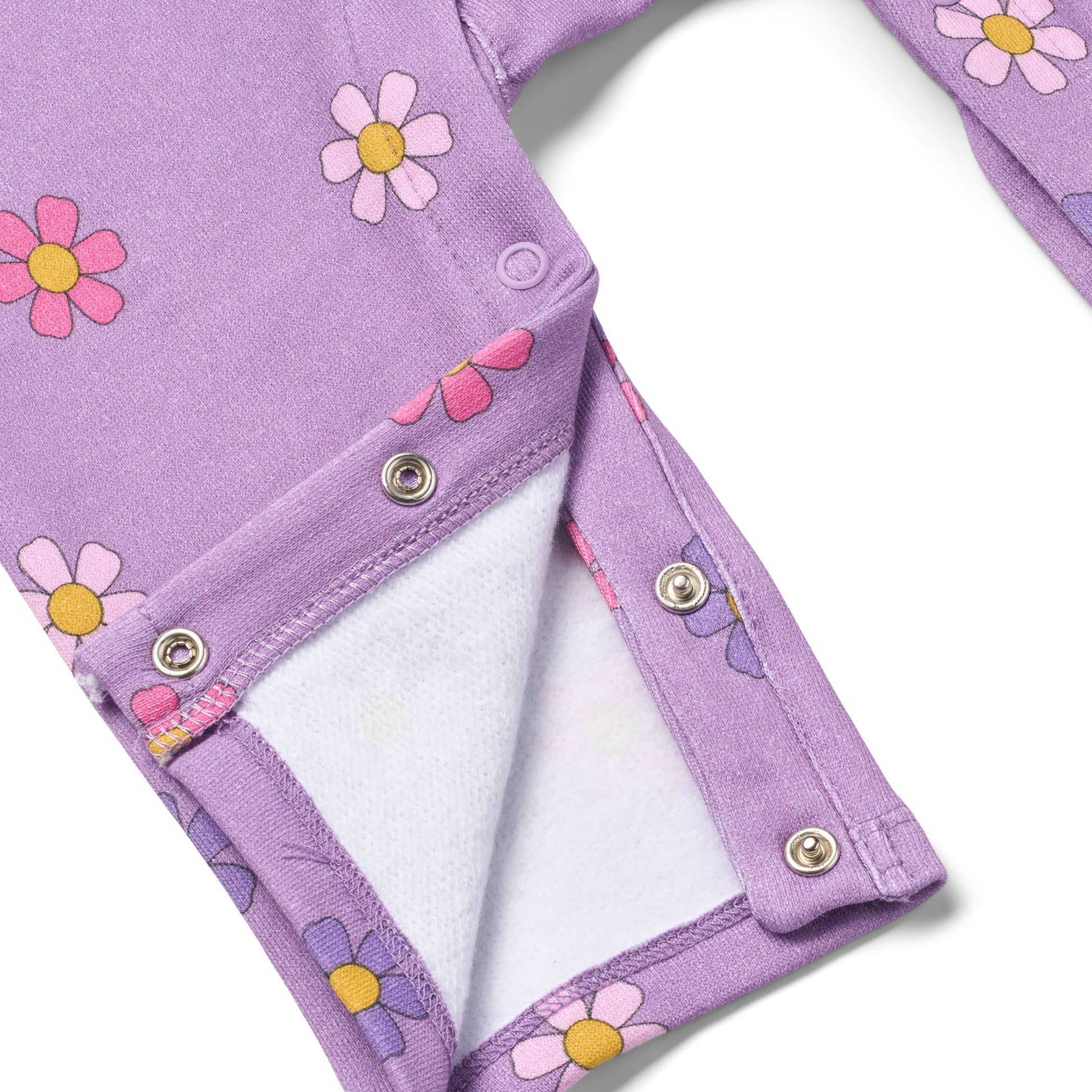 やわらかくて暖かい裏起毛スウェット素材(オーガニックコットン100%)で仕立てた、フラワープリントのベビーオーバーオールです。