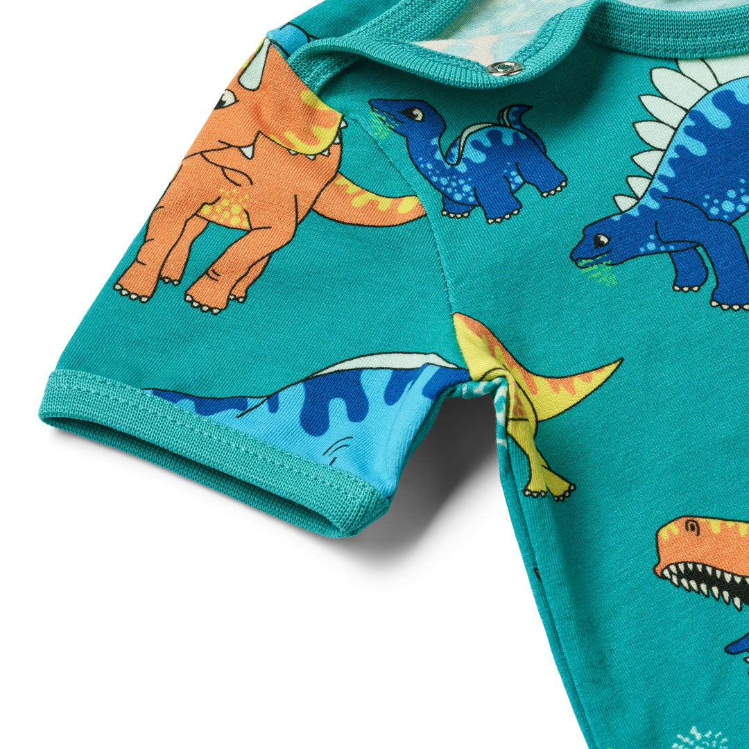 オーガニックで伸縮性のあるコットンジャージーを使用した、恐竜の半袖ロンパース。この商品はエコテックス規格100®の認証を受けており、お子さまの肌と健康を守るため、有害な化学物質が含まれていないことを確認済みです。肩と股にプレススタッズが付いているので、着替えも簡単です。スモー・フォークのロンパースはデンマークでデザインされており、繰り返し使用しても型崩れや色落ちがしにくいです。